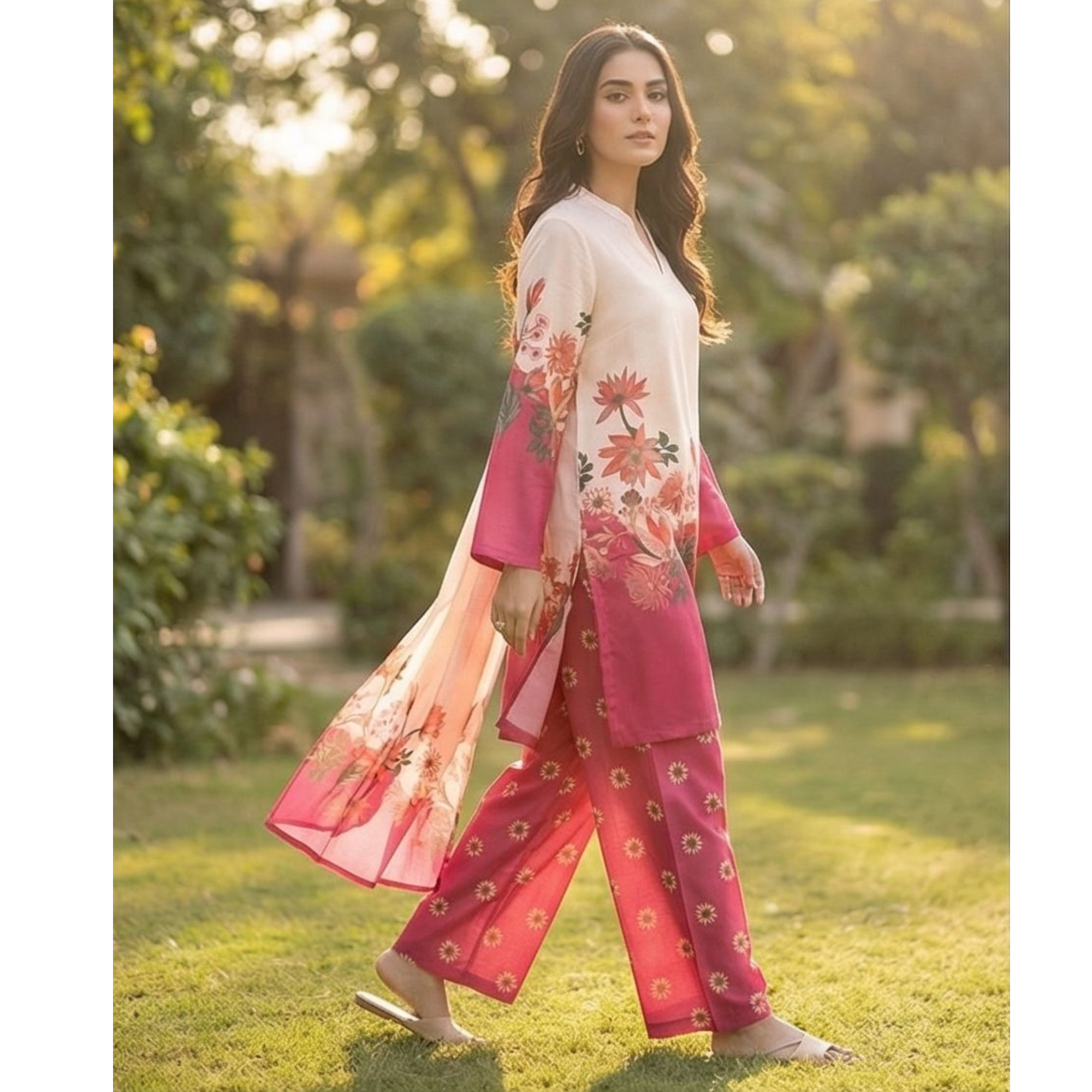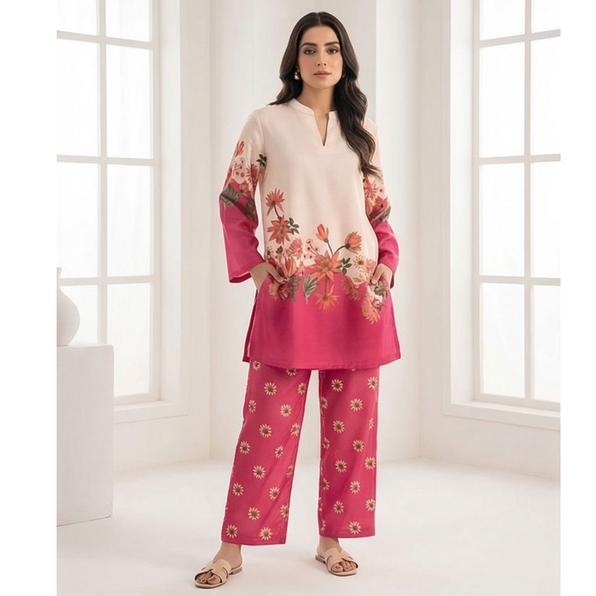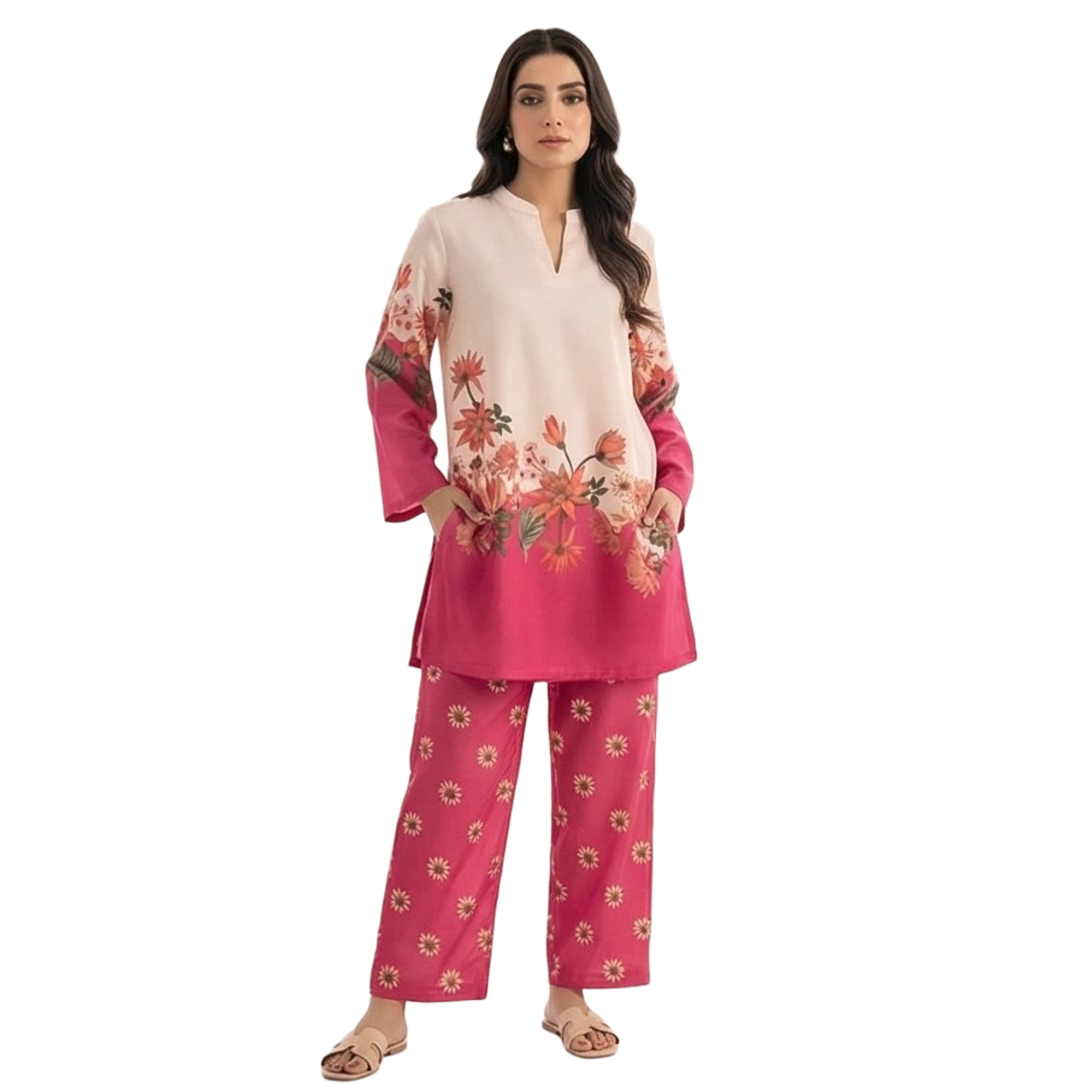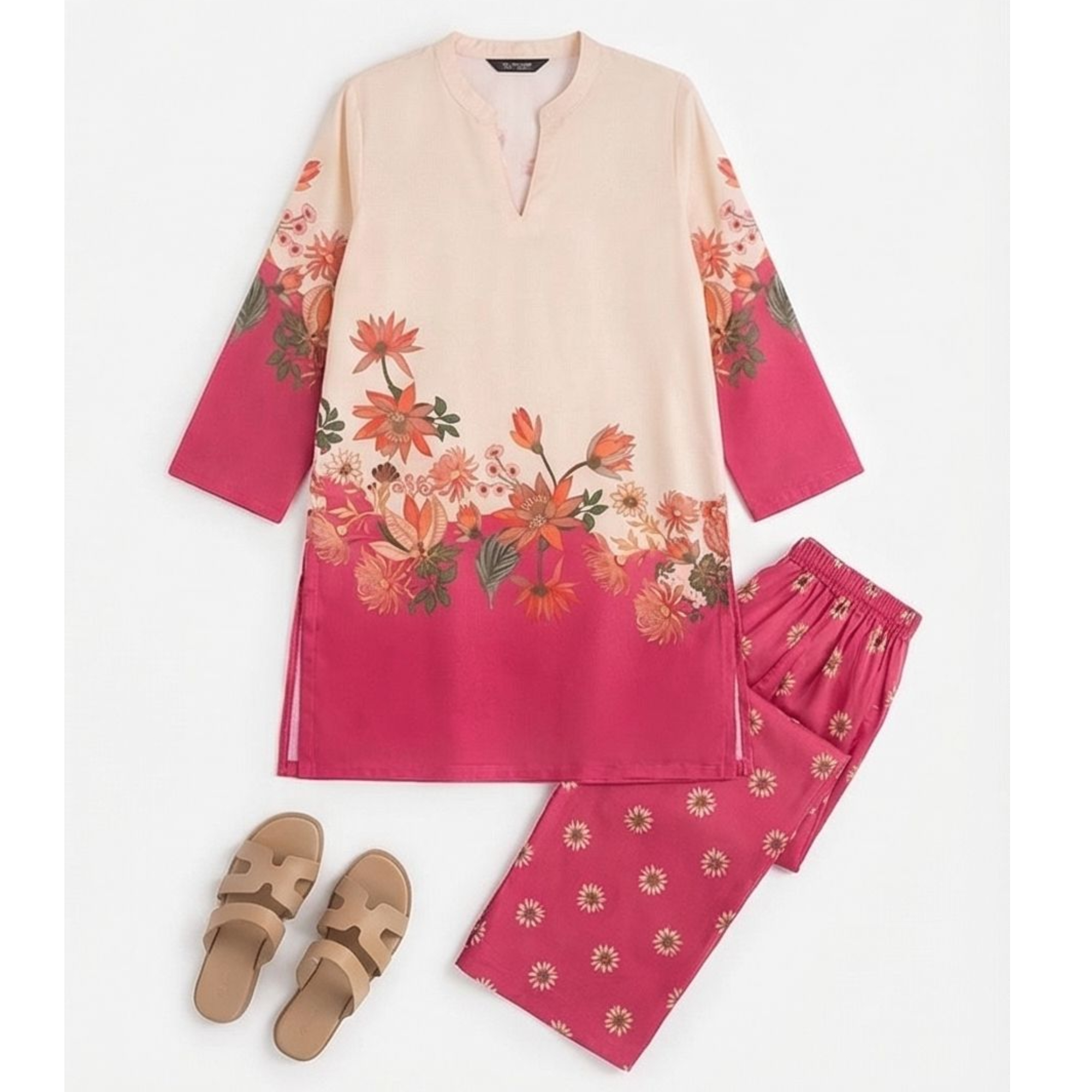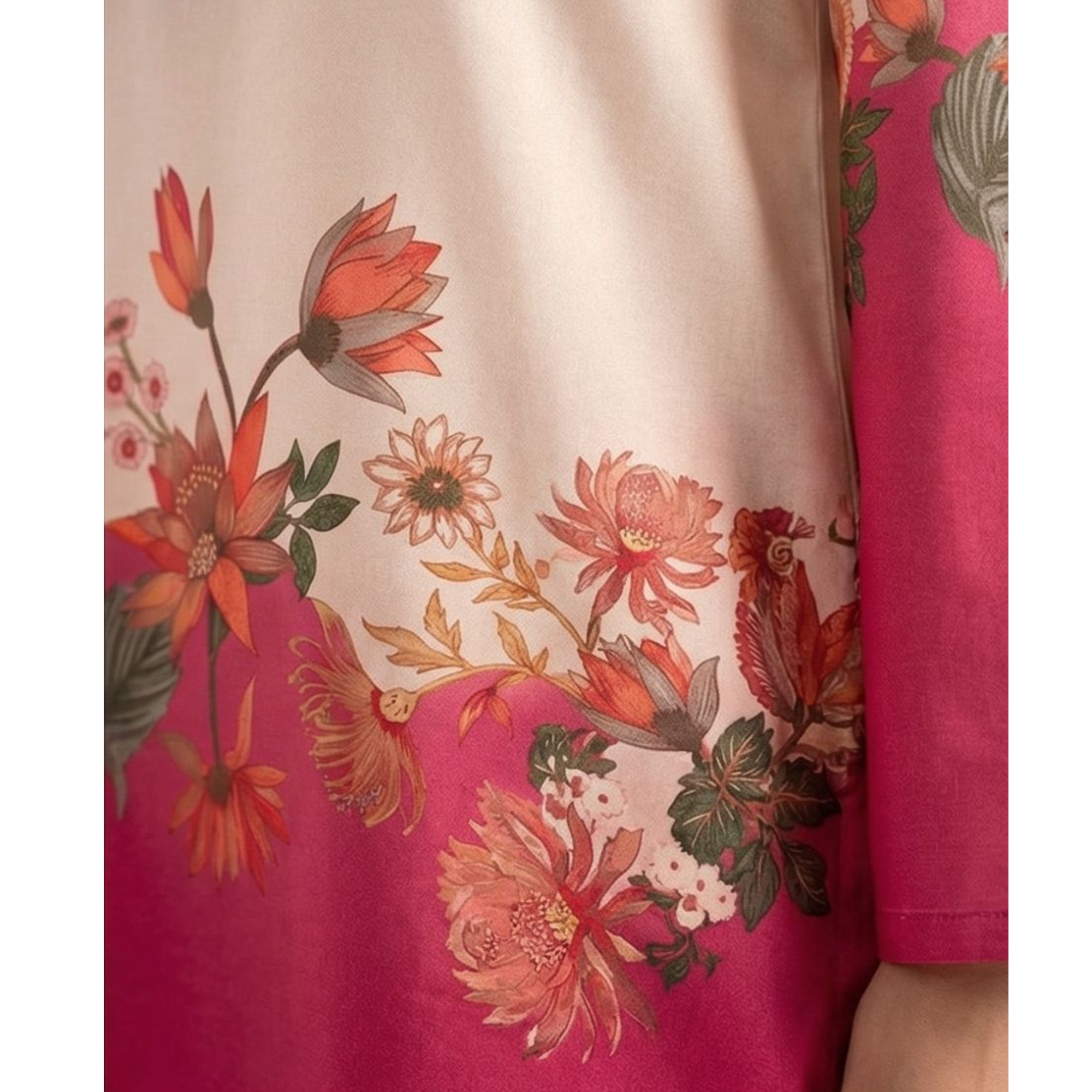 The top features a soft, soothing ivory base adorned with delicate floral prints that gracefully flow into a vibrant pink gradient. The subtle V-neckline and relaxed silhouette add a touch of minimal elegance, making it ideal for both casual outings and semi-formal occasions. The full sleeves with contrasting floral detailing enhance the overall aesthetic, giving it a refined yet trendy appeal.