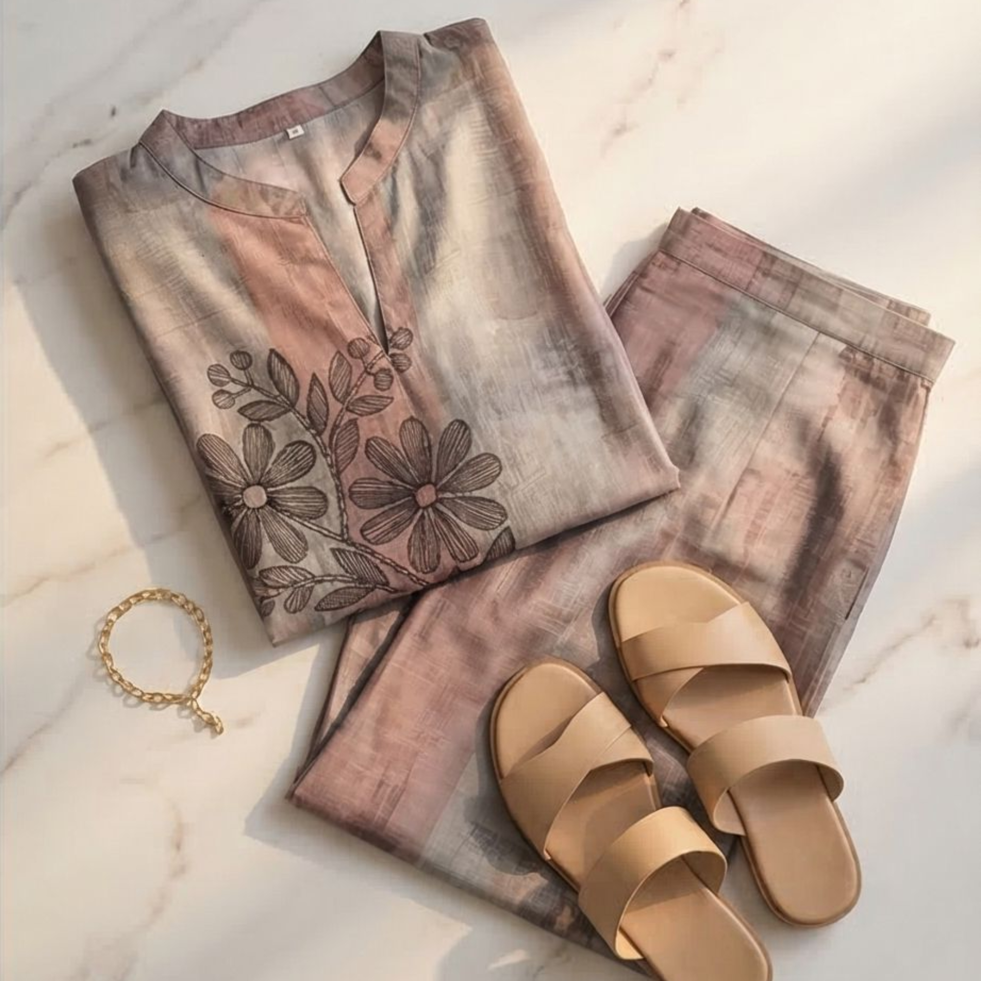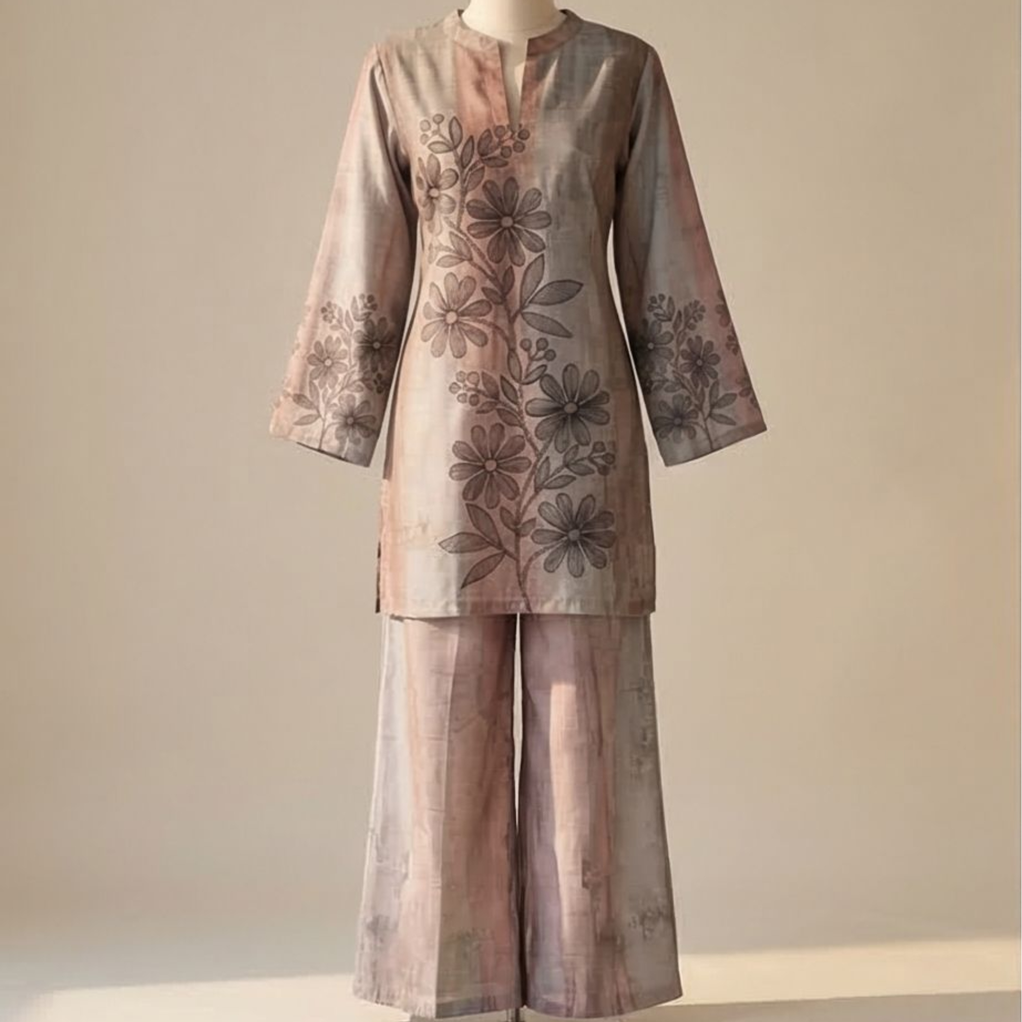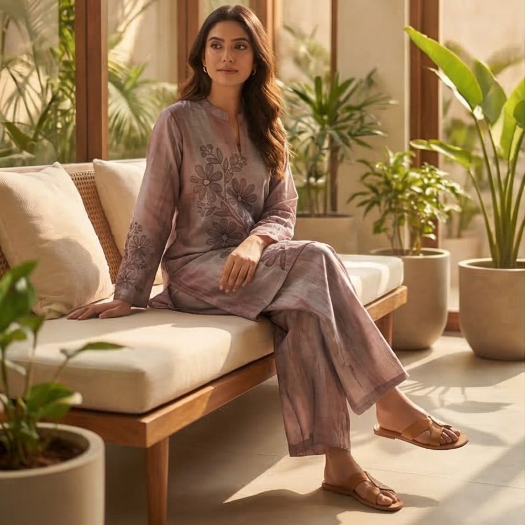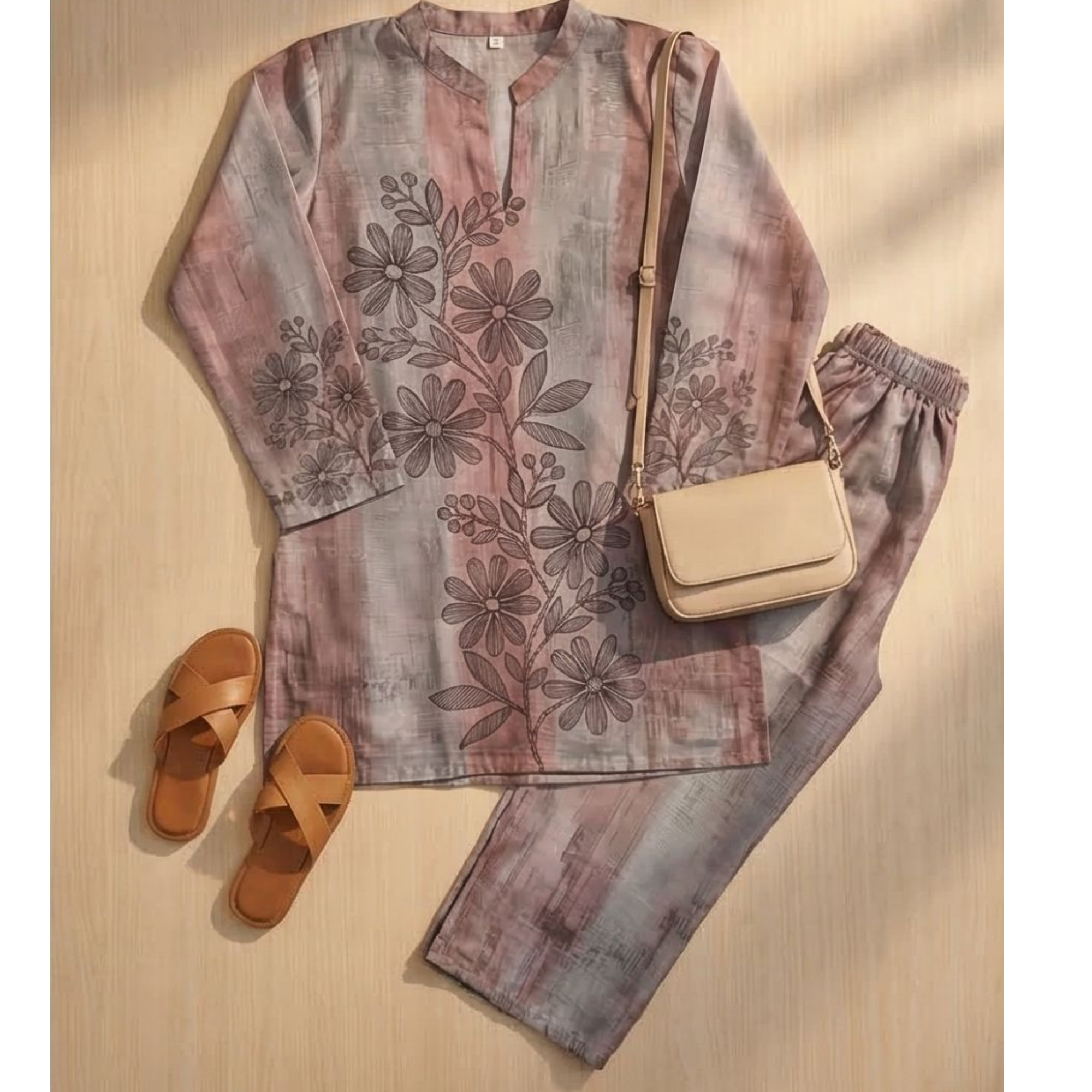 Introducing the RN VIVA Women Coord Set, a stunning ensemble that effortlessly blends traditional artistry with contemporary style. This beautifully crafted set features a kurta adorned with intricate floral embroidery at the front, showcasing delicate daisy and leaf motifs that add a touch of elegance to the overall look. The kurta is paired with matching wide-leg trousers, both featuring a gorgeous tie-dye print in soft, earthy tones of dusty rose, taupe, and grey that create a dreamy, watercolour effect. The kurta boasts a classic V-neckline and a relaxed silhouette, making it both stylish and comfortable for all-day wear. This coord set is perfect for casual outings, festive gatherings, or any occasion where you want to make a graceful impression. Style it with strappy sandals and minimal gold jewellery for a complete, polished look. Please refer to the size chart before placing your order to ensure the perfect fit. Hand wash recommended for best care.