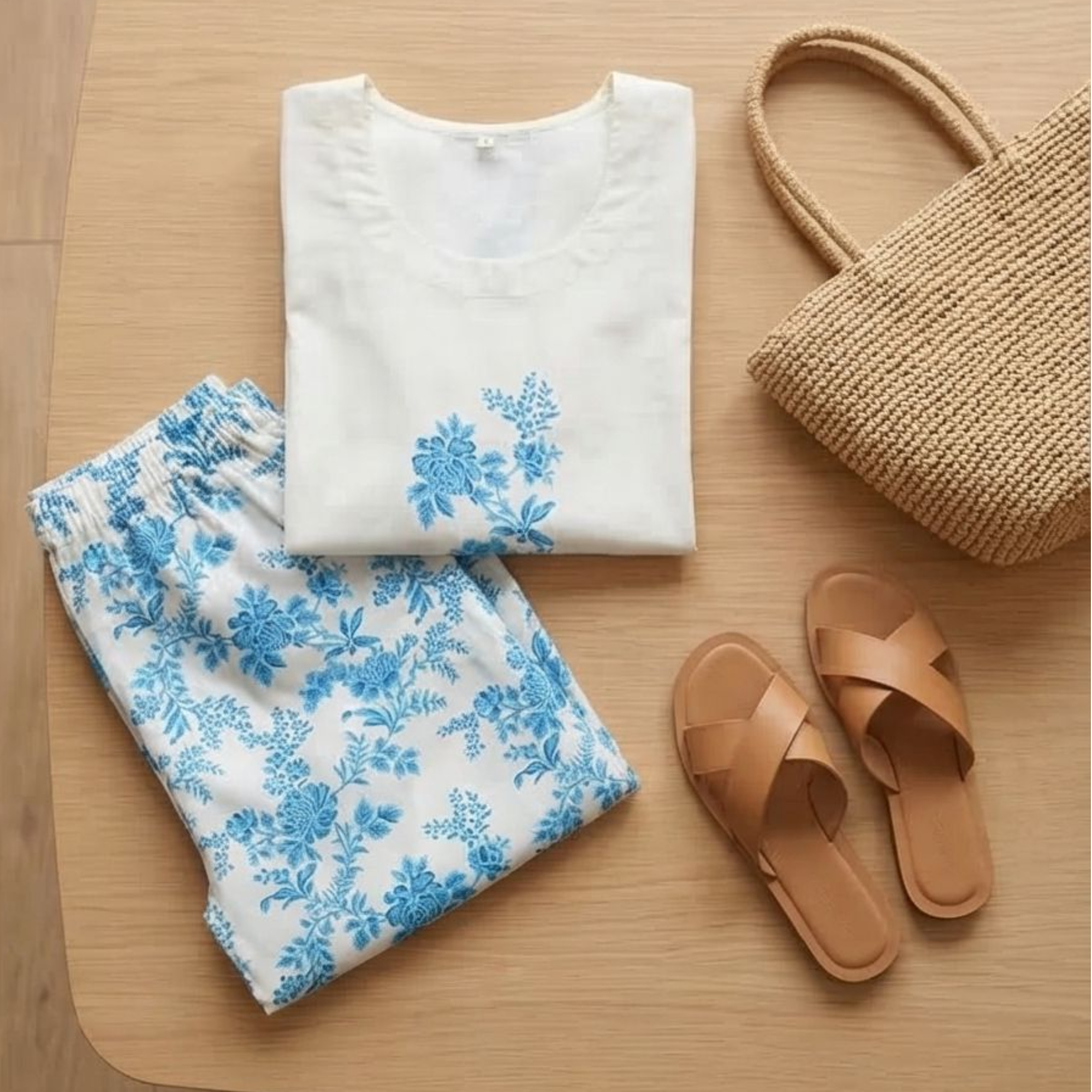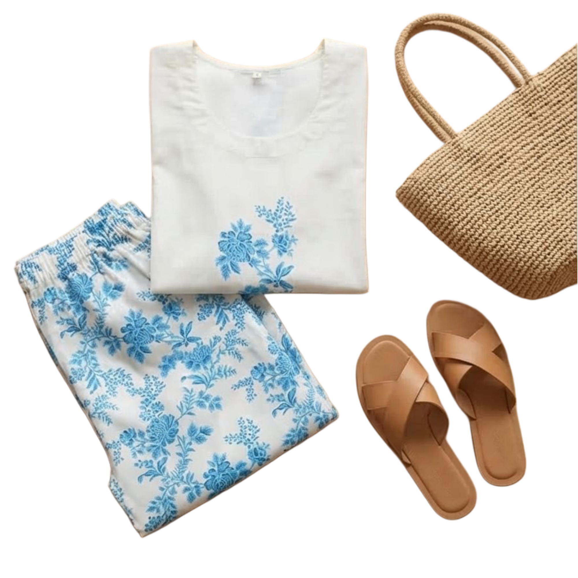 Women Coord Set, White with Blue Floral Print, Top and Pants