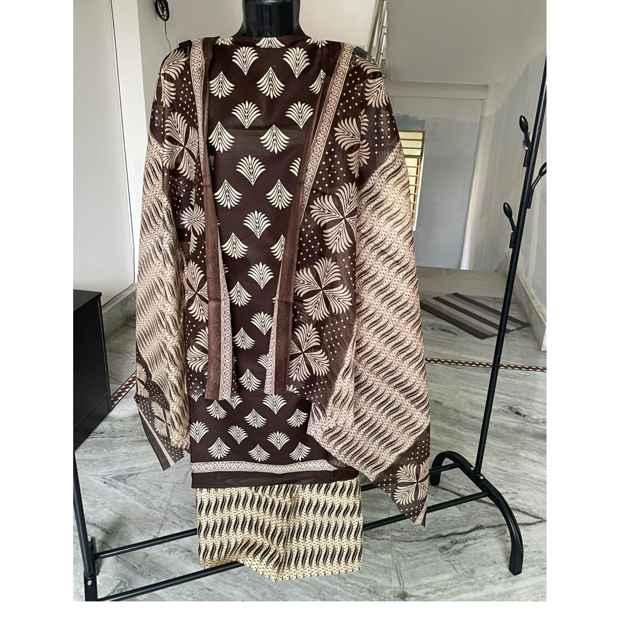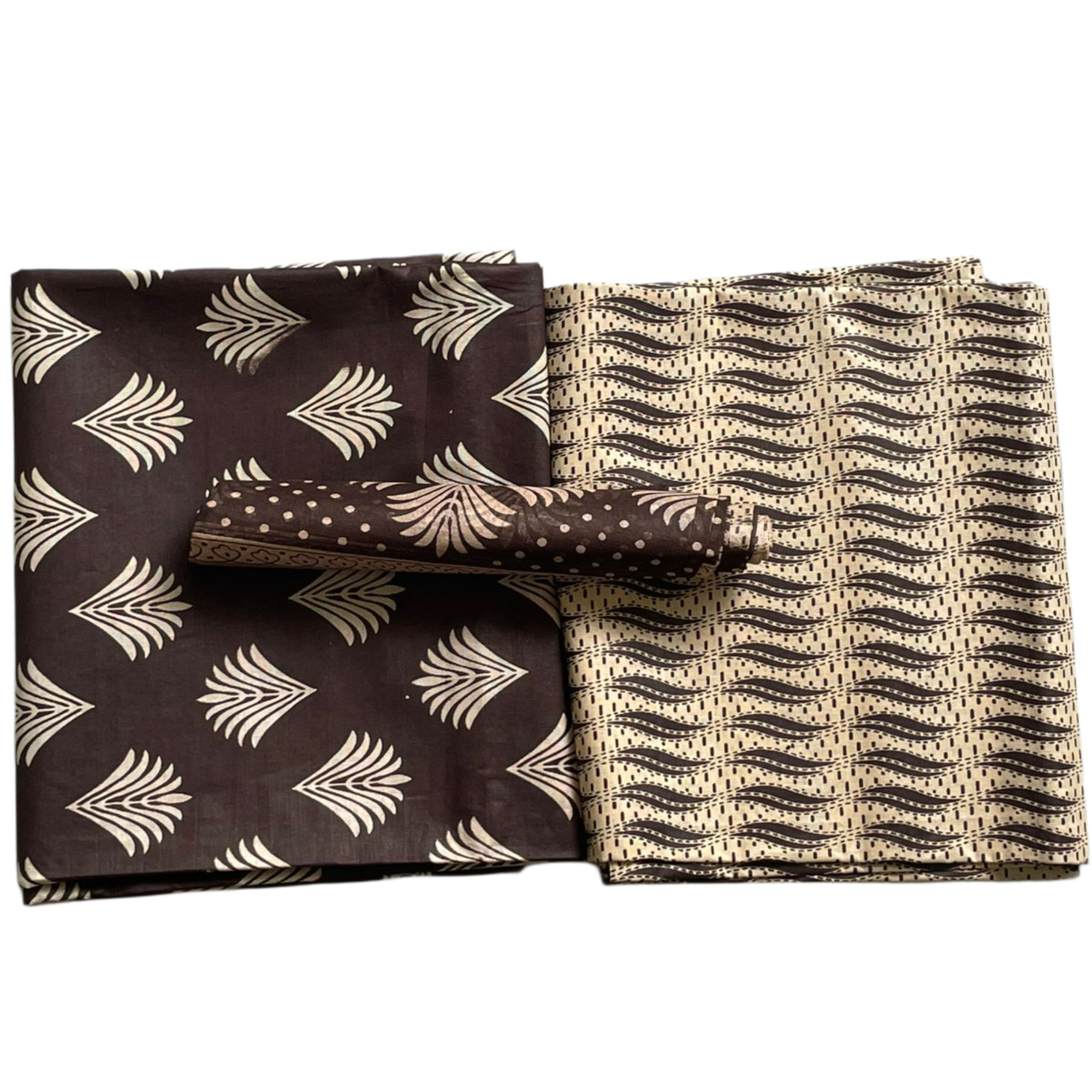 Introducing the RN VIVA Cotton Unstitched Salwar Suit in a stunning combination of brown and beige. This elegant fabric set features two beautifully contrasting prints — a rich dark brown base adorned with a bold floral fan pattern, and a complementary beige fabric with a graceful wave and geometric design. The set also includes a coordinating dotted dupatta fabric, making it a complete ensemble ready for stitching as per your preferred style and fit. Crafted from soft cotton, this unstitched suit is breathable and comfortable, making it ideal for everyday wear as well as festive occasions. The classic brown and beige colour palette lends a sophisticated, timeless appeal that suits women of all ages. Since the suit is unstitched, you have the freedom to get it tailored to your exact measurements and preferred silhouette. Please refer to the product images for a closer look at the print details before placing your order.