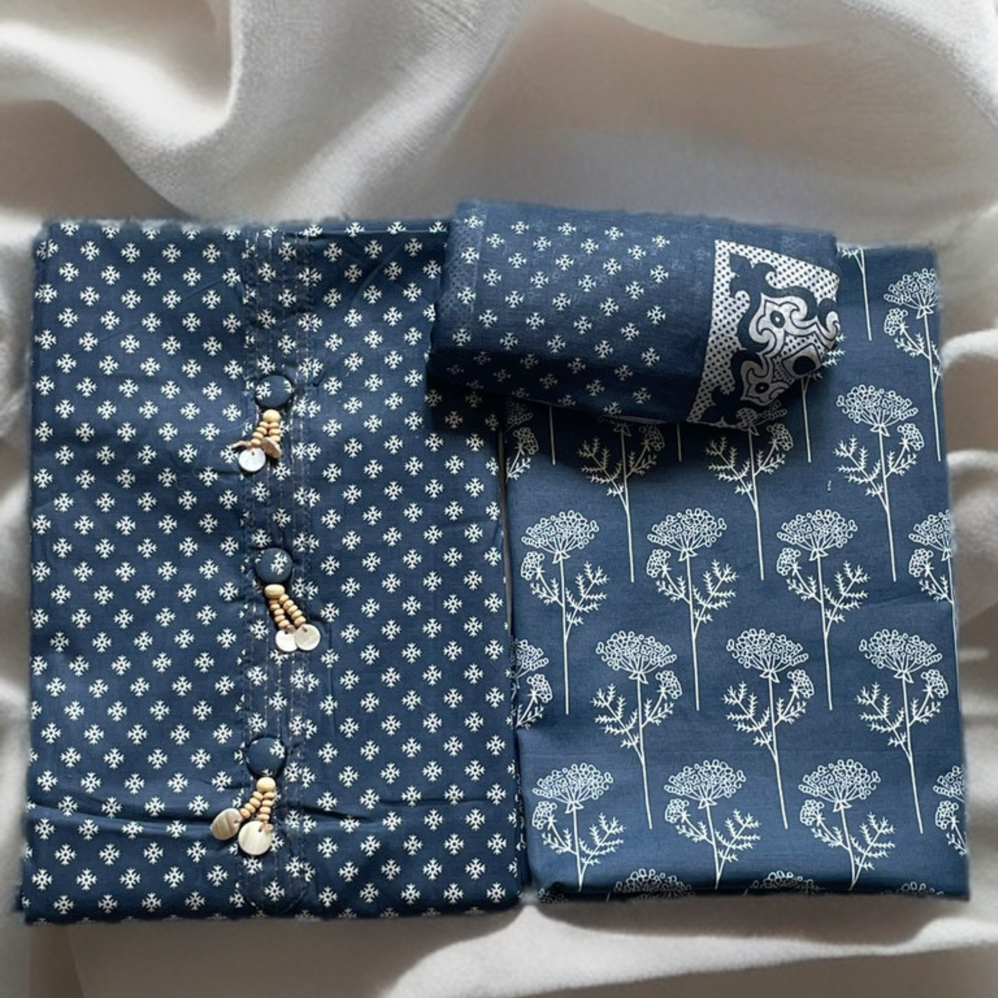 Introduce effortless elegance to your wardrobe with the RN VIVA Women’s Cambric Suit in a rich navy blue hue. This unstitched dress material comes as a complete set, allowing you to tailor the outfit to your exact measurements and preferred style. The kurta fabric features a delicate all-over floral print with charming bead and shell button detailing along the placket, adding a touch of artisanal craftsmanship. The dupatta showcases a contrasting botanical print with graceful white floral motifs on a matching navy blue base, creating a cohesive yet visually interesting ensemble. The soft cambric fabric is lightweight and breathable, making it comfortable to wear throughout the day. Ideal for casual outings, festive gatherings, and family functions, this suit material offers versatility and style in equal measure. The set includes fabric for the kurta, salwar, and dupatta. Please consult a skilled tailor to stitch the outfit as per your preferred fit and measurements. We recommend dry cleaning or gentle hand washing to maintain the fabric’s quality and colour vibrancy.