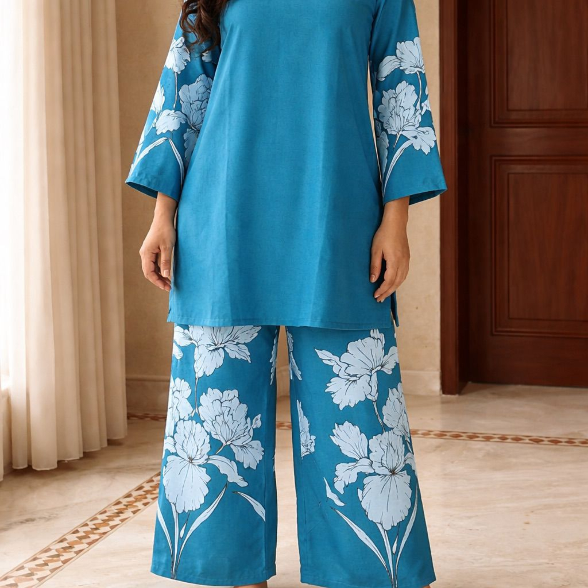 Complete 2-Piece Co-Ord Set – Includes straight fit kurti with matching printed palazzo pants for a perfectly coordinated outfit.